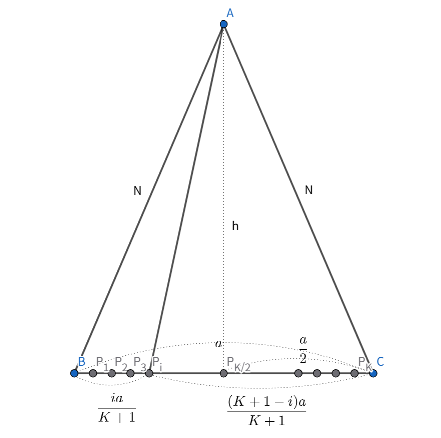 - 피타고라스 정리를 이용하여 $h$와 $\overline{AP_i}^2$를 나타낼 수 있다.$\overline{P_iP_\frac{K}{2}}=\overline{BP_\frac{K}{2}}-\overline{BP_i}=\frac{a}{2}-\frac{ia}{K+1}$$=N^2-\frac{a^2}{4}+\frac{a^2}{4}-\frac{ia^2}{K+1}+\frac{i^2a^2}{(K+1)^2}=N^2-\frac{ia^2}{K+1}+\frac{i^2a^2}{(K+1)^2}$
