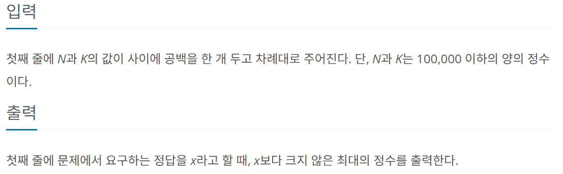 - N과 K가 100,000 이하의 양의 정수이므로 결과값은 int 범위를 넘어간다. 즉, 형변환이 필요하다.