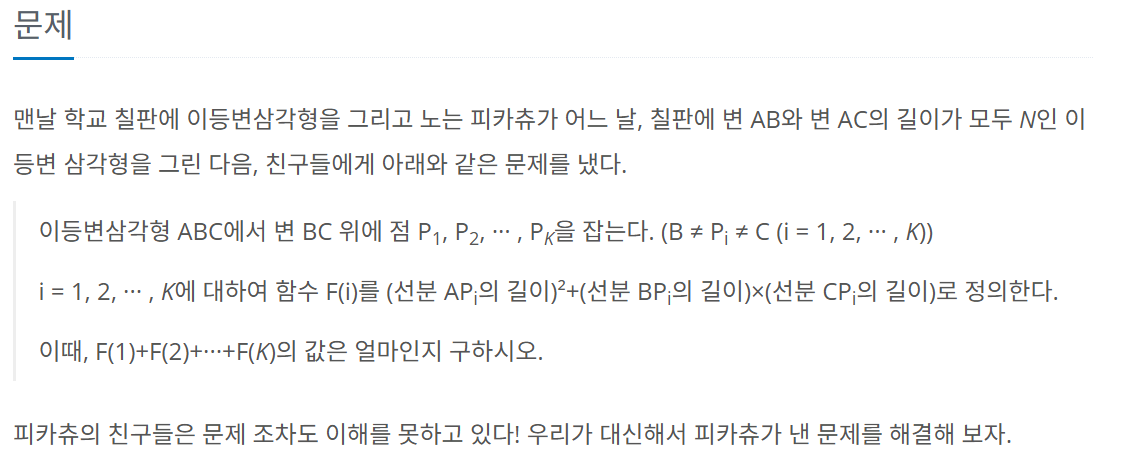 - 앞서 나타낸 식으로 $\overline{BP_i}\times \overline{CP_i}$를 나타낼 수 있다.이를 바탕으로 $F(i) = \overline{AP_i}^2 + \overline{BP_i}\times \overline{CP_i}$를 계산해보면,이때, i값은 1부터 k까지 변화하므로 $\displaystyle\sum_{i=1}^{k} F(i) = \displaystyle\sum_{i=1}^{k} N^2 = N^2 \times K$이다.