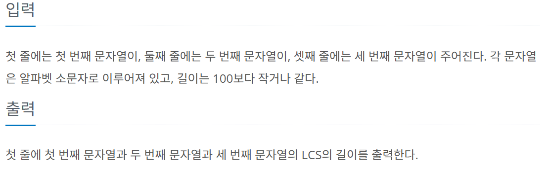 - 처음에는 두 문자열을 먼저 비교하여 LCS를 찾고, 찾은 LCS와 세 번째 문자열의 LCS를 찾는 방법으로 해결할 수 있을 것이라 생각했다. 그러나 이 문제에는 치명적인 문제점이 있어 올바른 정답을 구할 수 없다. 백준 질문 게시판에 올라와 있는 반례를 활용하였다.
