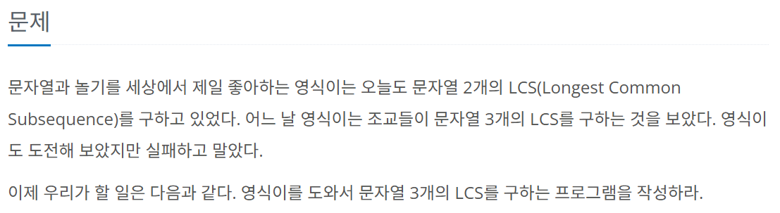 - LCS(Longest Common Subsequence, 최장 공통 부분 수열)문제는 DP를 사용하여 해결할 수 있다. 이 LCS 3 문제는 앞서 해결했던 LCS 문제를 바탕으로 해결할 수 있다. 자세한 설명은 아래 링크를 참조하자.