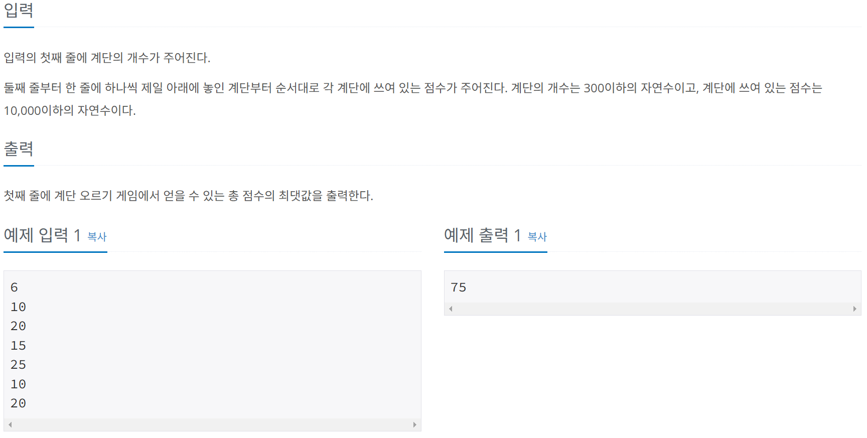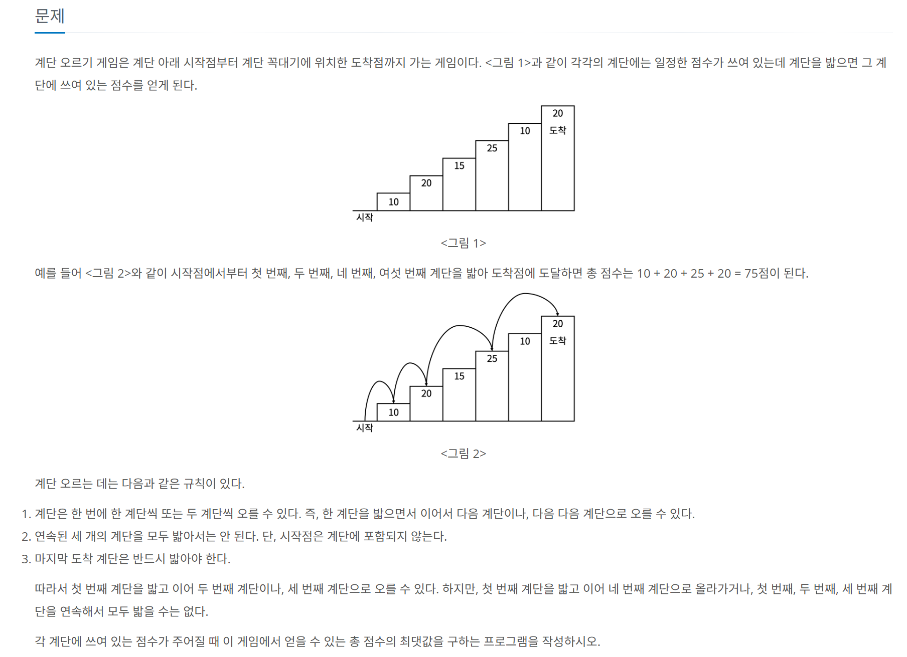 따라서 i번 계단의 누적 점수가 최대가 되기 위해서는 두 값 중 더 큰 값을 선택하여 dp[i]에 저장하면 된다.