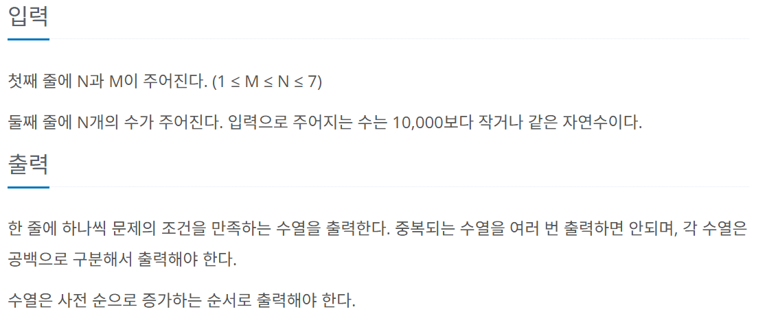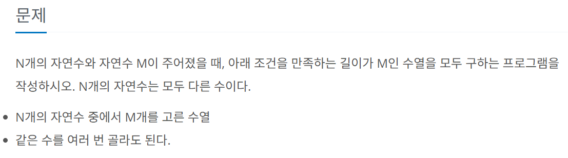 - N과 M 시리즈는 조건에 만족하는 수열을 모두 출력하는 문제이다. 확률과 통계에서 배우는 순열, 조합, 중복순열, 중복조합을 구현한다고 생각하면 된다.