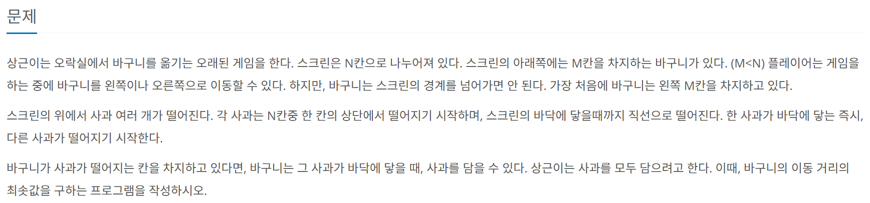예를 들어, 현재 바구니가 1~5번 칸을 차지하고 있고, 사과가 3번 칸에 떨어진다면, 바구니를 움직이지 않아도 자연스럽게 사과가 바구니에 담길 것이므로 이동 거리의 최솟값은 0이다.