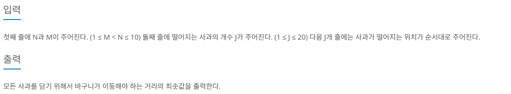예를 들어, M=3이고 초기 상태에서 5번 칸에 사과가 떨어진다면, 바구니의 오른쪽 끝을 3→5로 이동하면 되므로, 이동 거리의 최솟값은 2이다.