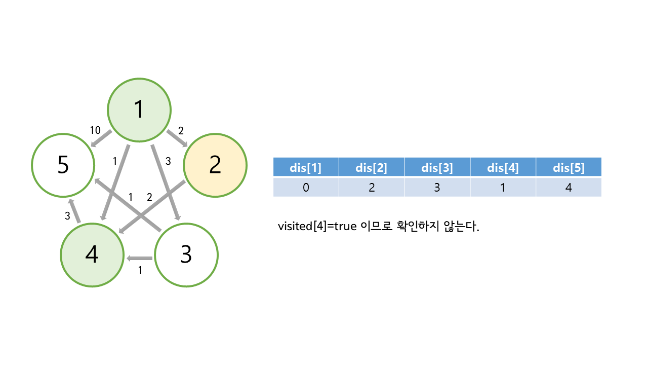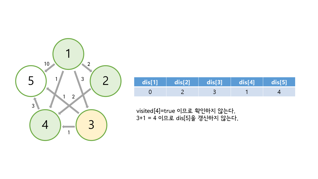 그러나 4번 도시는 이미 방문한 도시이므로 거리를 갱신할 필요가 없다. (이미 최솟값이기 때문.)