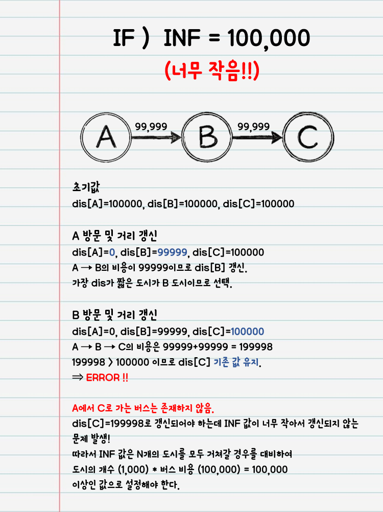 - 먼저 버스의 정보를 모두 받아 2차원 벡터(v)에 저장한다. 두 도시를 연결하는 버스 정보가 없는 길은 무한으로 나타내야 하므로 초기값을 모두 INF으로 저장한다. INF 값은 도시의 개수(1,000) * 버스 비용 (100,000)인 100,000,000 이상으로 설정해야 한다. 그 이유는 아래 그림과 같다.