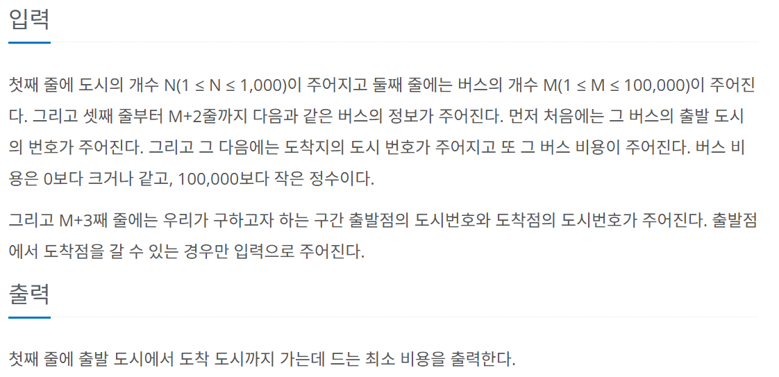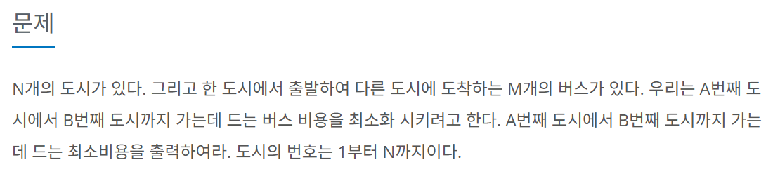 - 주의해야 할 점은 노드에서 노드로 가는 간선이 유일하지 않다는 점이다. 즉, A 도시에서 B 도시로 가는 버스가 여러 개 존재할 수 있다.