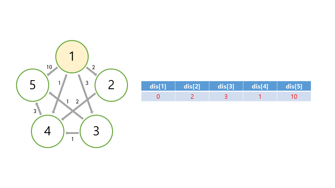 아직 방문하지 않은 도시들 중 가장 비용이 작은 도시를 선택하여 visited 값을 true로 변경한다. 4번 도시의 비용이 1로 가장 작으므로 visited[4]=true로 변경하였다. 그 후, 4번 도시를 거쳐간 경우의 비용이 더 적은 경우가 있다면 dis 값을 갱신한다. dis[5]의 기존 값은 10인데, 1번-4번-5번으로 이동하는 경우에는 1+3=4의 비용이 든다. 1번 도시에서 5번 도시로 바로 이동하는 것보다 4번 도시를 거쳐 이동하는 것의 비용이 더 적으므로 값을 갱신한다.