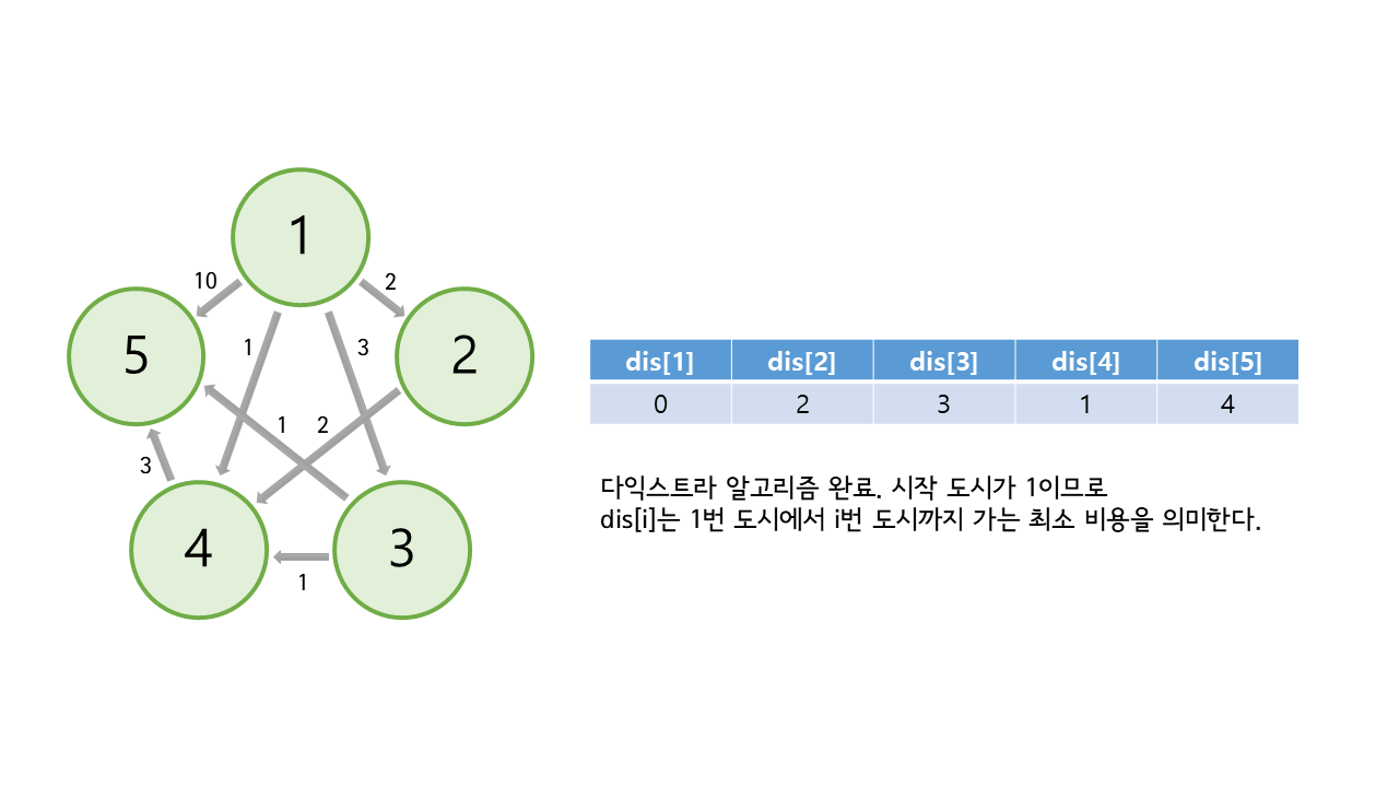 다익스트라 알고리즘이 완료되었다. 시작 도시(1번)부터의 각 도시까지의 거리를 모두 계산했으므로, 도착 도시까지의 거리를 출력하기만 하면 된다.