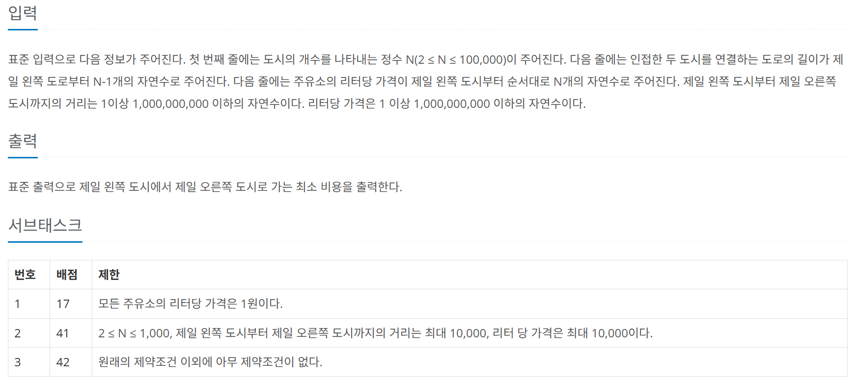- 각 도로의 길이와 리터당 가격은 최대 1,000,000,000이므로 정수형 자료형은