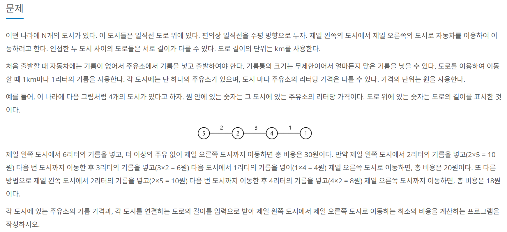 - 최소 비용으로 제일 오른쪽의 도시로 이동하기 위해서는, 각 구간에서의 최소 비용으로 기름을 넣고 이동해야한다. 따라서 구간별로 현재 도시까지의 최저 기름 가격을 저장하고, 그 가격을 기준으로 다음 도시로 이동하는 것을 반복하면 최적의 가격을 갱신하며 최소 주유 비용을 구할 수 있다. 즉, 그리디 알고리즘을 활용하여 문제를 해결할 수 있다.