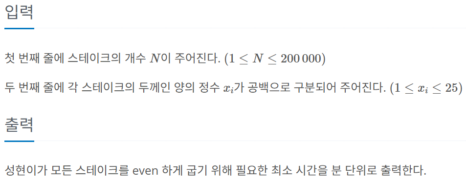 - N개의 스테이크가 모두 even 하게 익은 상태가 되려면 모든 스테이크의 최소공배수를 각 스테이크의 두께로 나누었을 때의 몫이 짝수여야한다.