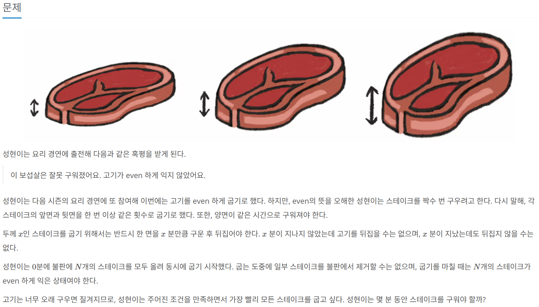 - 두께가 x인 스테이크를 뒤집을 때는 반드시 x분만큼 구운 후 뒤집어야 하므로, 각 스테이크의 적어도 최소공배수만큼의 시간이 필요하다.
